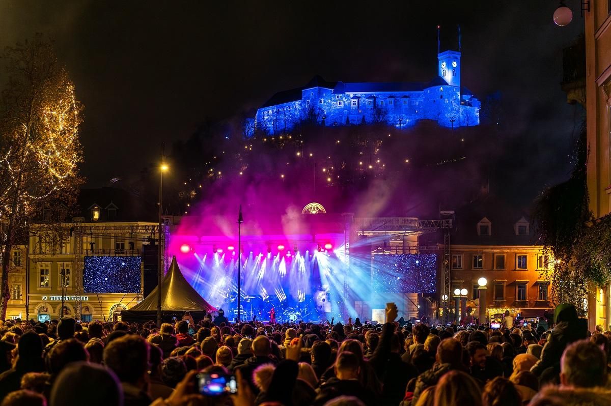 リュブリャナ旧市街の広場では音楽ライブやイベントが行われ、カウントダウンの瞬間には花火が夜空を彩ります。
