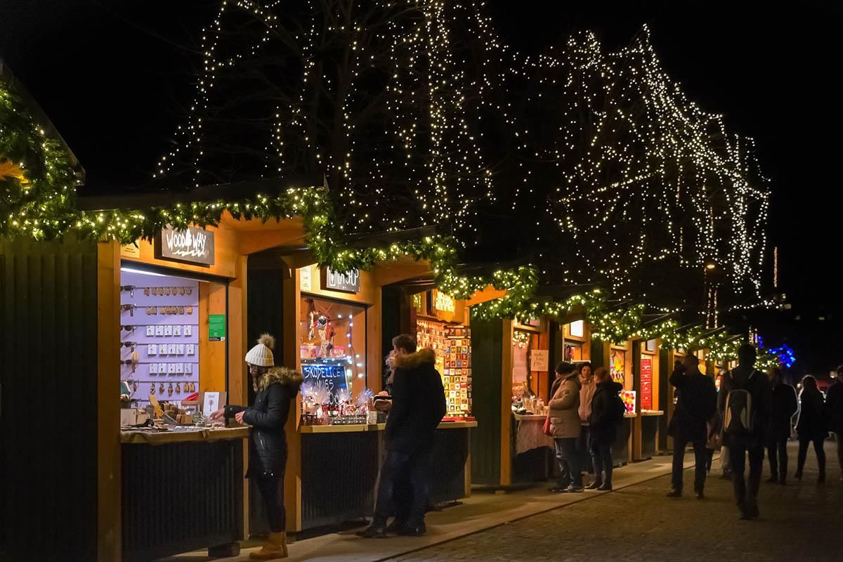 川沿いに並ぶ屋台。ホットワインや地元のスイーツの良い香りが漂います。