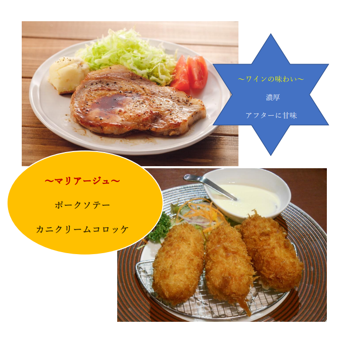 しっかりとした果実味とふくよかさがあるため、コクのある料理と相性抜群。たとえば、金柑のマリネやポークソテー、蟹クリームコロッケ、チキングラタン、カボチャのニョッキなど。クリーミーで濃厚な味わいの料理と合わせると、ワインの持つ優しい厚みが料理を包み込むように調和します。